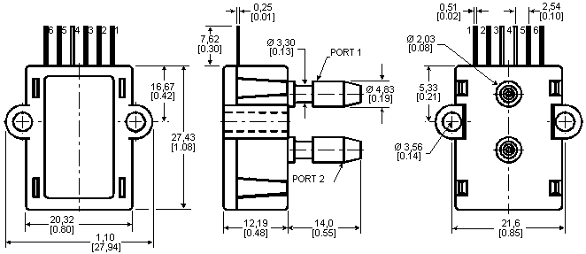1.Mô tả Dải áp suất đo: ±20 inH2O. Áp suất tối đa cho phép: 5 psi. Điện áp cung cấp: 3.0 Vdc min., 12.0 Vdc typ., 16.0 Vdc max. Loại port: Loại có gai. Điện áp ngõ ra tại điểm không: 0 mV typ. Nhiệt độ hoạt động: -25 °C to 85 °C [-13 °F to 185 °F]. 2.Kích thước ==>Chọn các mã sản phẩm khác của Series DCXL-DS