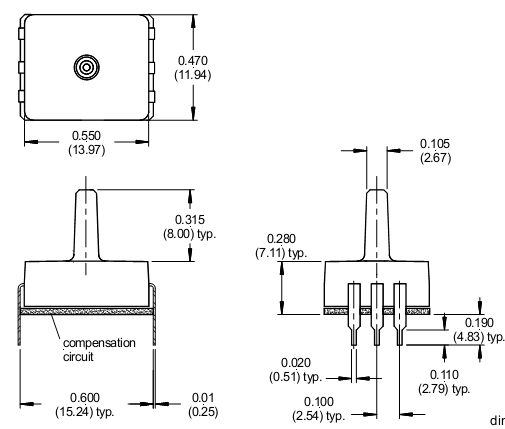 1. Cảm biến áp suất thấp Honeywell SDX05G2-ALoại không cần bộ khuếch đại.Dải đo: 0 psi to 5 psiÁp suất tối đa có thể tác động lên cảm biến: 20 psi max.Điện áp cung cấp: 20 Vdc max.Hiệu chỉnh ngõ ra: có.Loại port: ThẳngĐiện áp điểm không: -1.0 mV min., 0.0 mV typ., 1.0 mV max.Độ chính xác lập lại: ± 0.5% span.Trở kháng ngõ vào: 4.0 kOhm typ.Trở kháng ngõ ra: 4.0 kOhm typ.Nhiệt độ hoạt động: -40 °C to 85 °C [-40 °F to 185 °F]2.Kích thước Chọn các sản phẩm của Cảm biến áp suất thấp Honeywell