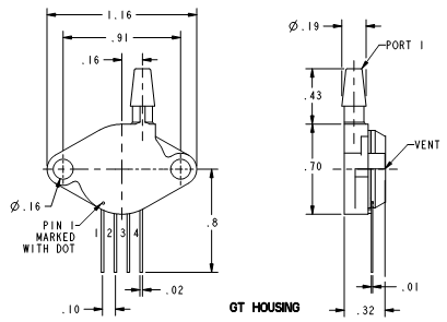 1.:Cảm biến áp suất thấp Honeywell XPC30GTCLoại đo: Chân không, tiêu chuẩn.Không cần bộ khuếch đại.Dải đo: ±30 psi.Quá áp suất: 90 psi max.Điện áp cung cấp: 3 Vdc min., 12 Vdc typ., 16 Vdc max.Điều chỉnh ngõ ra: có.Loại port: Có ngạnh.Độ nhạy: 3 mV/psi typ.Điện áp điểm không: 0 mV typ.Điện trở ngõ vào: 5.0 kOhm min.Điện trở ngõ ra: 3.0 kOhm typ.Nhiệt độ hoạt động: -25 °C to 85 °C [-13 °F to 185 °F].2.Kích thướcChọn các sản phẩm của Cảm biến áp suất thấp Honeywell