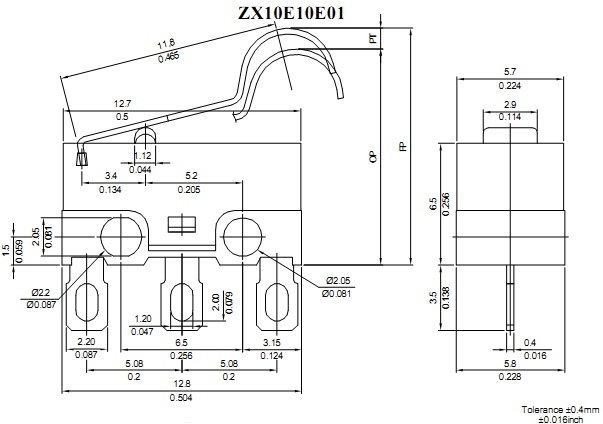 1.: Công tắc hành trình Honeywell ZX10E10E01Công tắc Honeywell ZX10E10E01.Kích thước:6,5 mm H x 5,7 mm W x 12,7 mm L.Sealed: Không có.Dòng tải cho phép: 0.1 A.Loại tiếp điểm: SPDT.Cơ cấu tác động: Cần gạt có hình dạng trục lăn.Chân cắm: Loại hợp kim.Nhiệt độ hoạt động:-40 °C to 85 °C [-40 °F to 185 °F].Độ ẩm tương đối: 85 % RH max. at 40 °C [104 °F].Điện áp hoạt động: 48 Vdc.Lực tác động:0,54 N [1.94 oz] max.Lực hồi về:0,08 N [0.28 oz] min.Tần số đóng ngắt điện: 400 lần/phút (max).Kích thước ốc lắp đặt: 2,3 mm [0.091 in].Mã UNSPSC: 30211905. 2. Kích thướcChọn các mã sản phẩm khác của Công tắc hành trình snap ZX