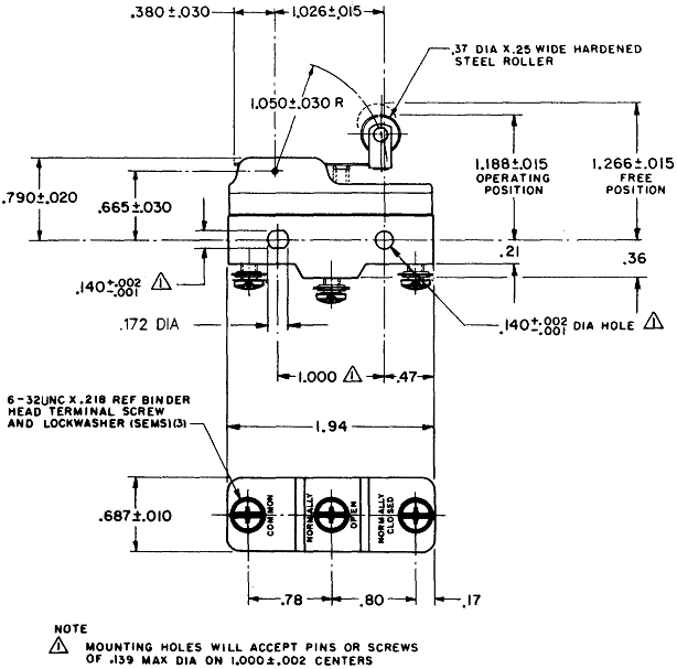 1.: Công tắc hành trình snap BZ-2RW82212TCông tắc honeywell BZ-2RW82212T.Kích thước:25,4 mm H x 17,8 mm W x 50,8 mm L.Dòng tải cho phép: 15 A.Loại tiếp điểm: SPDT.Cơ cấu tác động: Loại cần gạt có con lăn.Chân cắm: Loại bắt vít.Nhiệt độ hoạt động:-55 °C to 85 °C [-67 °F to 185 °F].Điện áp hoạt động: 250 Vac.Lực tác động: 1,67 N [6 oz] max.Lực hồi về: 0,42 N [1.5 oz] min.Độ dịch chuyển:2,39 mm [0.094 in] min.Kích thước ốc lắp đặt: 3,53 mm [0.139 in].Trọng lượng: 24,94 g to 34,01 g [0.055 lb to 0.075 lb].2. Kích thước: Chọn các mã sản phẩm khác của Công tắc hành trình snap BZ