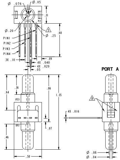 1.Mô tả Dải áp suất đo: ±30 psi Áp suất tối đa tác động lên cảm biến: 60 psi. Điện áp cung cấp: 10 Vdc typ., 16 Vdc max. Có điều chỉnh ngõ ra. Loại port: Thẳng. Thời gian đáp ứng: 1 ms max. Điện áp ngõ ra tại điểm có áp suất không: -2 mV min, 0 mV typ., 2 mV max. Trở kháng ngõ vào: 5.5 kOhm min., 7.5 kOhm typ., 11.5 kOhm max. Trở kháng ngõ ra: 1.5 kOhm min., 2.5 kOhm typ., 3.0 kOhm max. Nhiệt độ hoạt động: -40 °C to 85 °C [-40 °F to 185 °F] Khối lượng: 2 g [0.07 oz] 2.Kích thước ==>Chọn các mã sản phẩm khác của Series 26PC