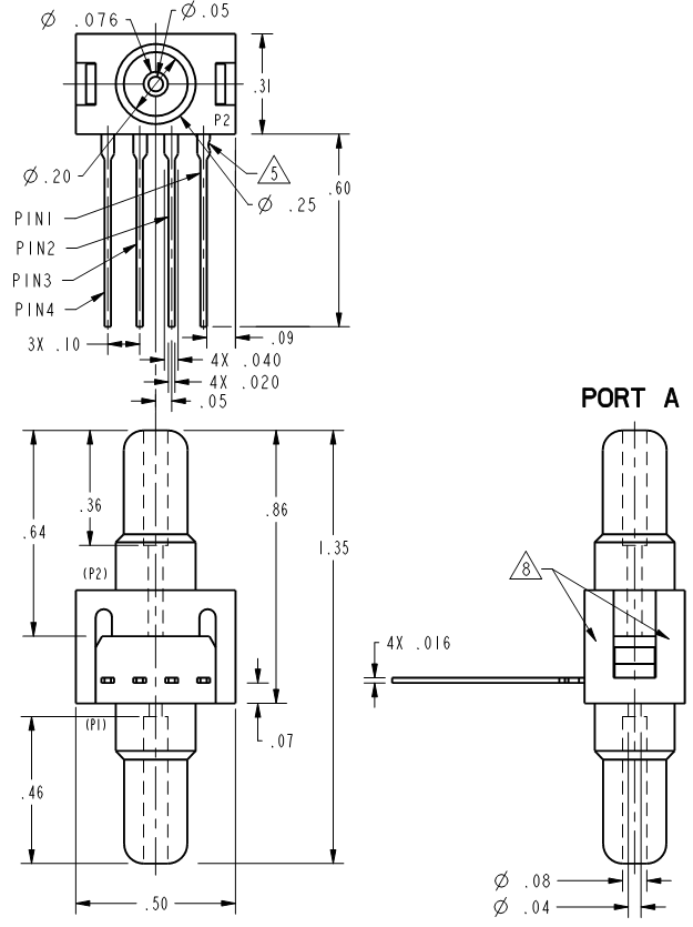 1.Mô tả Dải áp suất đo: ±100 psi Áp suất tối đa tác động lên cảm biến: 2000 psi. Điện áp cung cấp: 10 Vdc typ., 16 Vdc max. Có điều chỉnh ngõ ra. Loại port: Thẳng. Thời gian đáp ứng: 1 ms max. Điện áp ngõ ra tại điểm có áp suất không: 0 mV typ. Trở kháng ngõ vào: 5.5 kOhm min., 7.5 kOhm typ., 11.5 kOhm max. Trở kháng ngõ ra: 1.5 kOhm min., 2.5 kOhm typ., 3.0 kOhm max. Nhiệt độ hoạt động: -40 °C to 85 °C [-40 °F to 185 °F] Khối lượng: 2 g [0.07 oz]. 2.Kích thước ==>Chọn các mã sản phẩm khác của Series 26PC